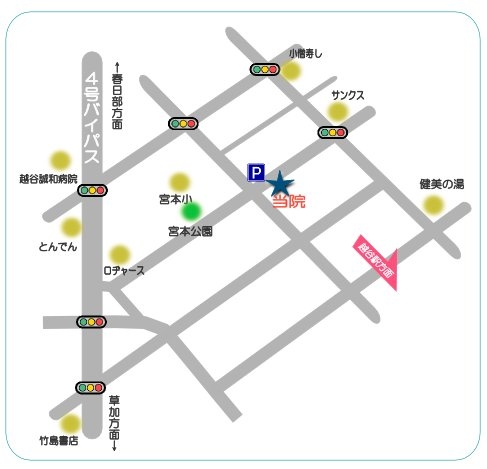■交通 (越谷駅より徒歩13分 駐車場完備)越谷駅より健美の湯先、コンビにを左折して下さい。 ■新患・急患随時受付予約が優先となります。 ■受付時間午前9:30~12:30 午後2:30~6: 30 |